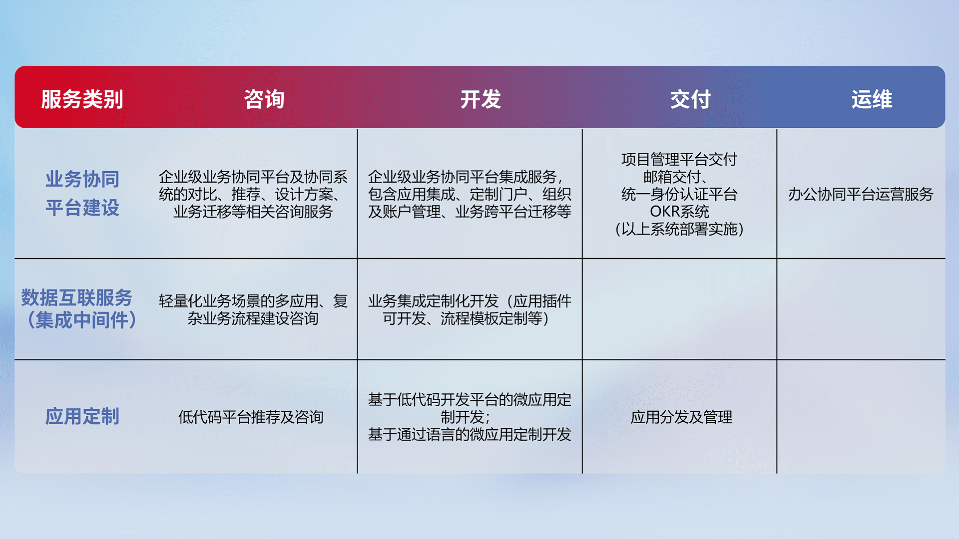 针对钉钉、、企微、、IDaas等平台级产品提供产品的规划、、、、方案、、交付、、、、定制化开发等服务,,实现如统一协同办公、、、、智能客户服务、、混合会议管理、、、、智能数据查询、、等业务场景,,,实现数字化转型。。。。